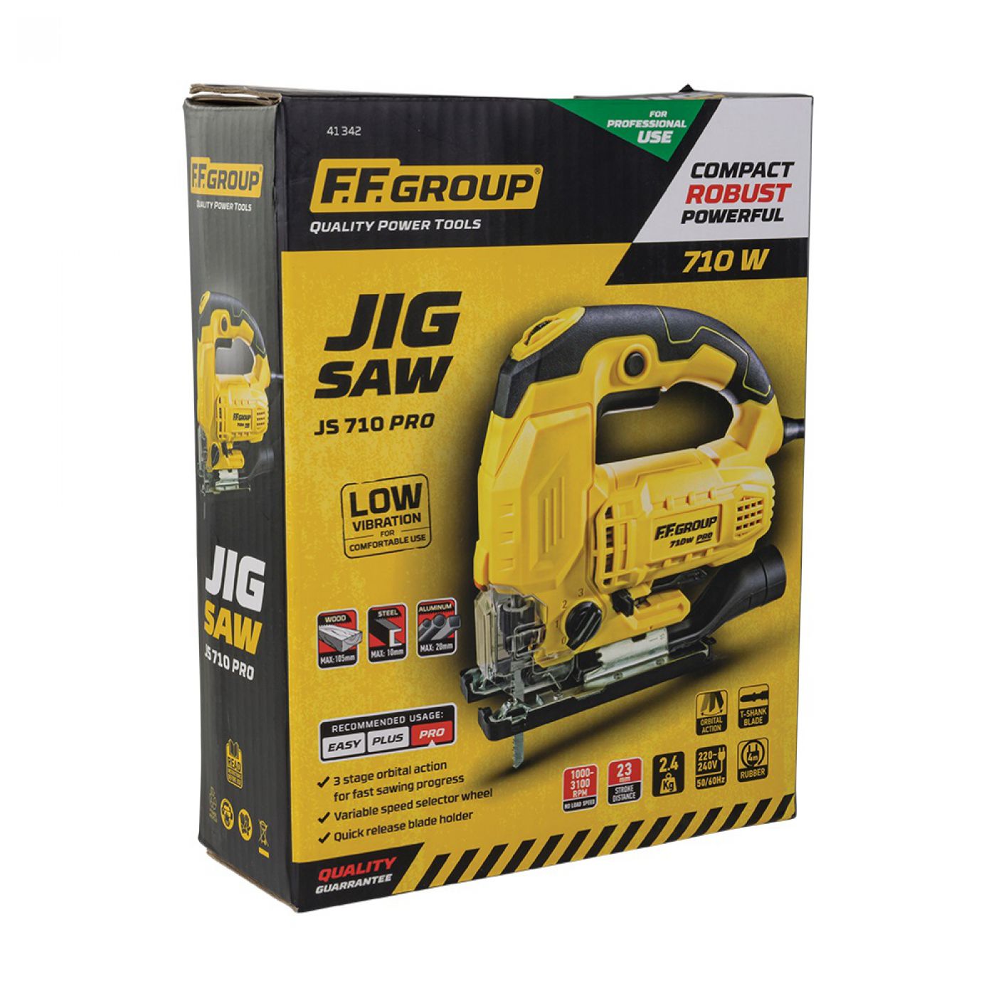 Σέγα JS 710 PRO 710W της FF Group. Διαθέτει περιστροφικό επιλογέα, υποδοχή λάμας γρήγορης απελευθέρωσης, κλειδί άλλεν για προσαρμογή της γωνίας και κοχλία ρύθμισης τροχιάς.
